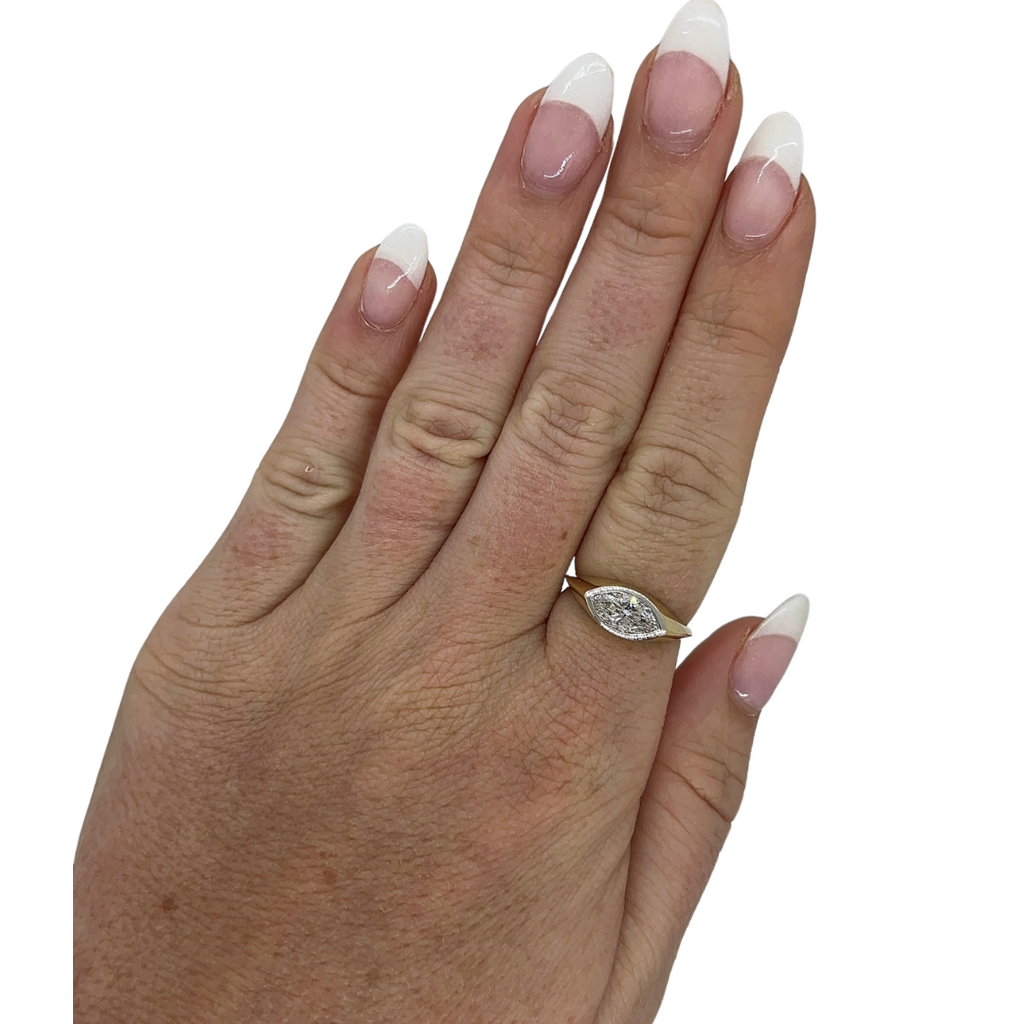 This Lab-Grown Diamond East to West Bezel Marquise Ring features a striking marquise-cut diamond set horizontally for a modern twist on a classic design. The bezel setting offers secure protection while emphasizing the stone’s unique shape and brilliance. Crafted with care, this ring combines style and durability, making it a thoughtful choice for those seeking both elegance and everyday wearability.