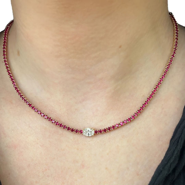 Elevate your look with our stunning Lab-Grown Ruby & E/W Oval Tennis Necklace. This elegant piece features dazzling lab-grown rubies and unique east-west oval diamond. Perfect for adding a touch...